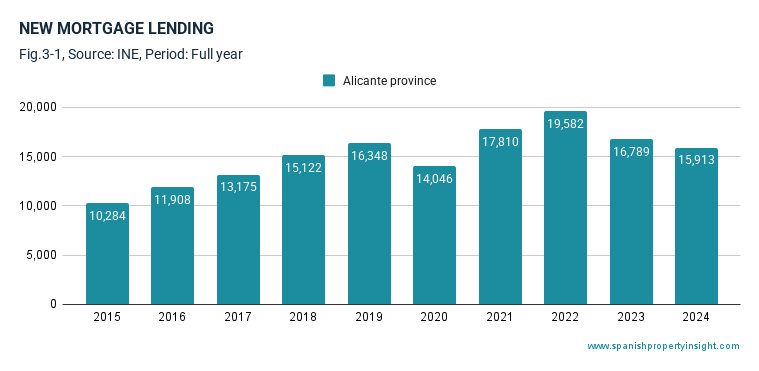 In 2024, a total of 15,913 new mortgages were signed in Alicante province (Fig. 3-1), down 5% year-on-year. However, compared to the ten-year average, mortgage activity increased modestly by 5%, and was up 55% over the decade, suggesting a stable financing environment over the long term.