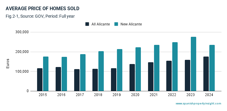 The average sale price of a home in Alicante in 2024 was €176,283, reflecting a robust annual increase of 11% (Fig. 2-1). This rise demonstrates continuing buyer confidence and strong demand for property in the region. However, new-build properties experienced a contrasting trend: the average price of new homes declined by 15% year-on-year to €235,365, indicating potential changes in buyer preferences or market correction from previous highs.