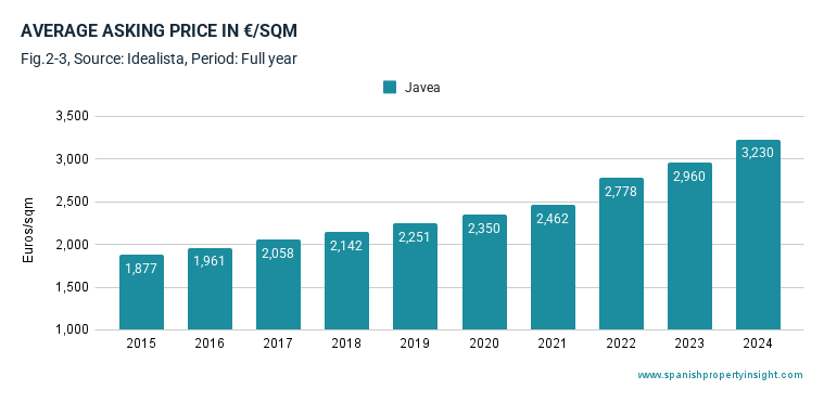 In Jávea (Xàbia)—one of the North Costa Blanca’s most sought-after towns—the average asking price stood at €3,230 per square metre, an annual increase of 9% (Fig. 2-3), according to data from property portal Idealista. Over five years, asking prices in Jávea have grown by 43%, and by 72% in ten years (nominal terms). This mirrors the high demand and limited supply in this popular lifestyle destination.
