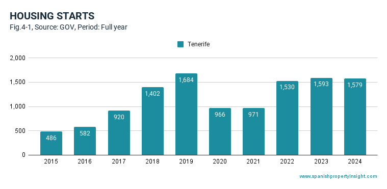 There were 1,579 new housing starts in Tenerife based on planning approvals during 2024 (Fig. 4-1). This number was in line with the previous year—just under 1% lower—and represents a 35% increase compared to the ten-year average. Over the last ten years, housing starts have risen by 225%, highlighting renewed construction activity from a previously low base.