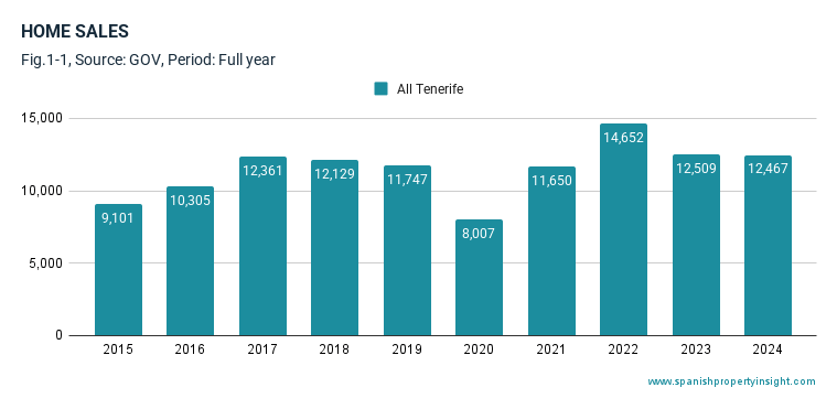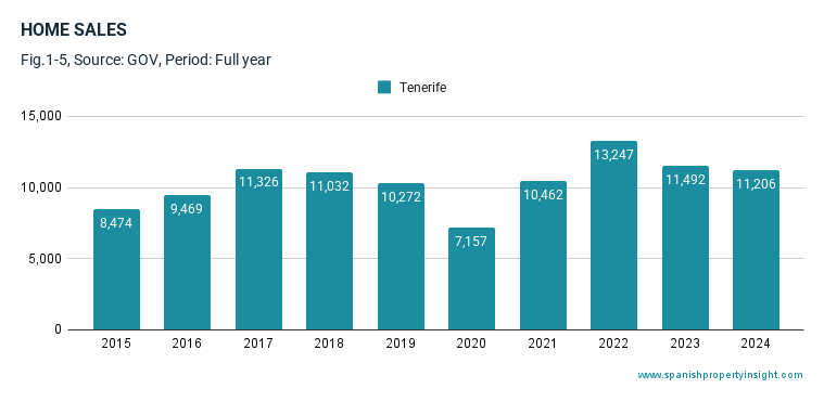 Tenerife recorded a total of 12,467 housing sales in 2024, virtually unchanged from the previous year, representing a year-on-year decrease of just 0.3% (Fig. 1-1). Compared to the ten-year average, transactions were 8% higher, and over the last decade, total sales volume has grown by 37%.