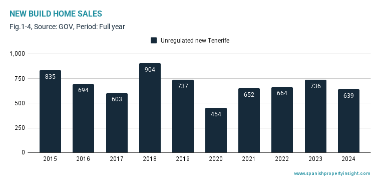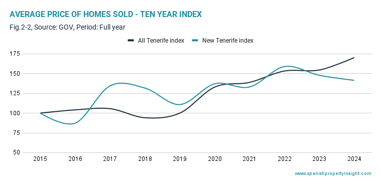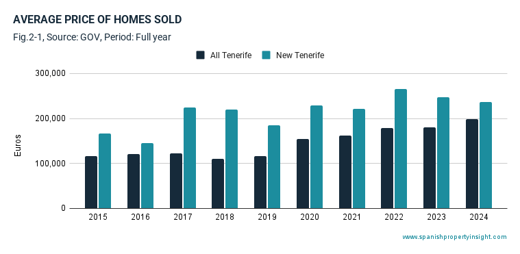Official data from the Spanish Housing Ministry placed the average sale price of homes in Tenerife at €198,008 in 2024, up 10% from the previous year (Fig. 2-1). In contrast, the average price for newly-built properties was €235,928, down by 4% year-on-year.