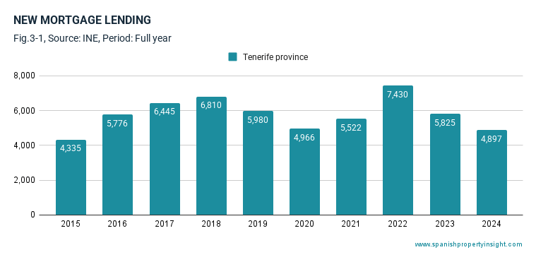 A total of 4,897 new mortgages were registered in Tenerife province in 2024 (Fig. 3-1), down 16% from the previous year. This figure is also 16% lower than the ten-year average, although volumes have still increased by 13% over the entire decade.