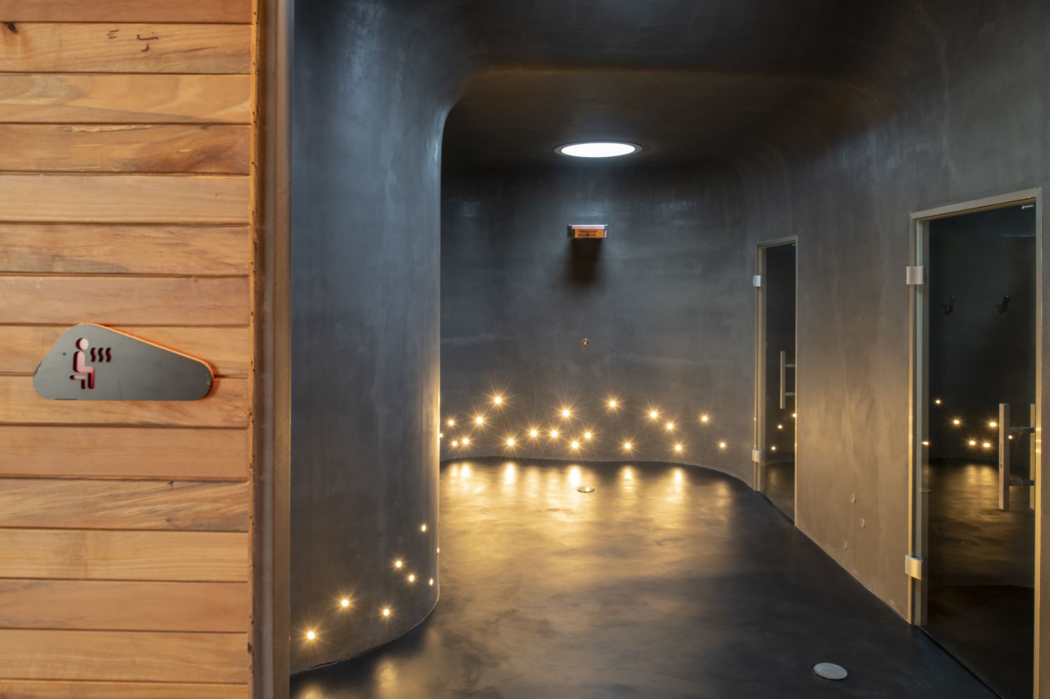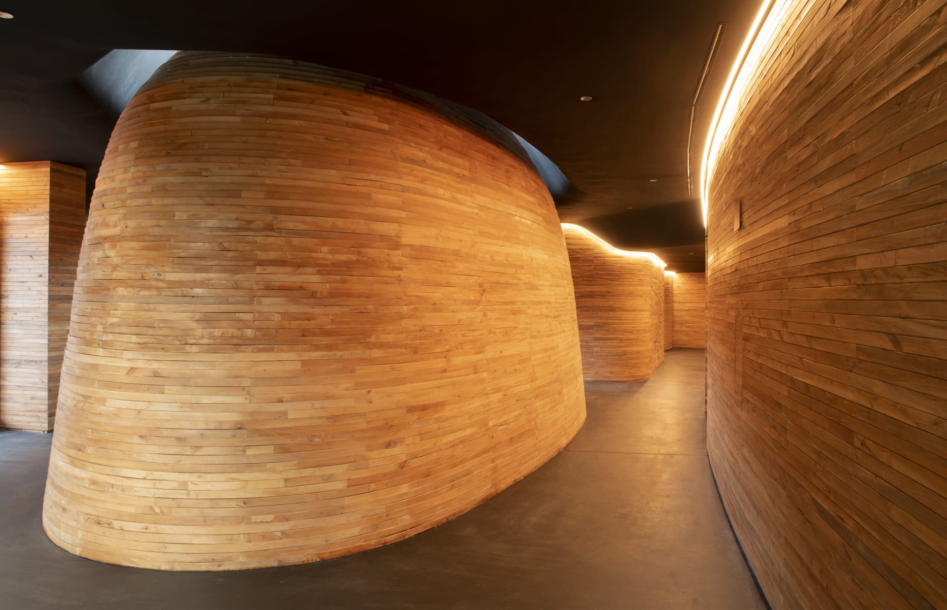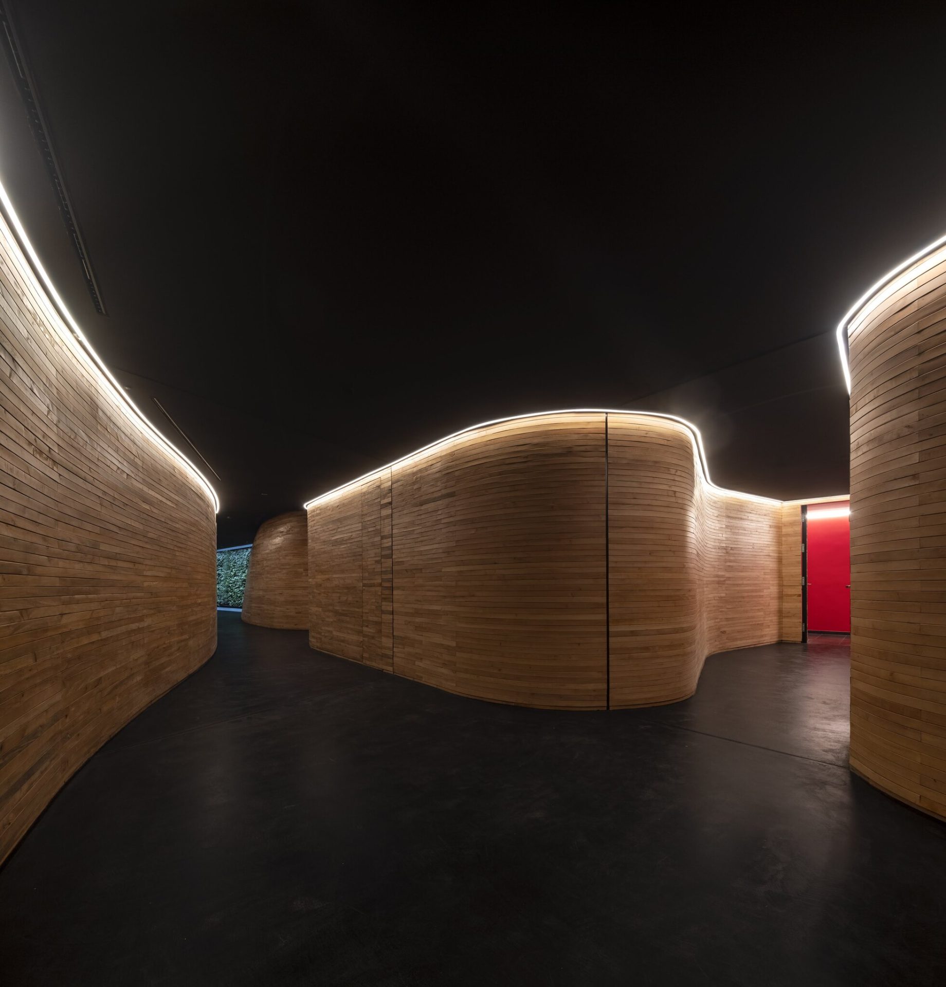 The urban vibe is offset in places by beautiful ‘green walls’ filled with living plants. This homage to nature is one of the focal points of the building’s incredible spa and fitness studio, which Decq was determined would not appear functional and bland. The natural planting is complemented by slate flooring and alder-wood panelling on the softly curved walls to give residents a cool, refreshing view while they work out. The centrepiece of the spa is Decq’s enormous bespoke yoga pod. Crafted by hand from alder wood and inspired by the work of the artist Gaudí, the yoga pod is both a dramatic work of art and a relaxing, cocooning space.