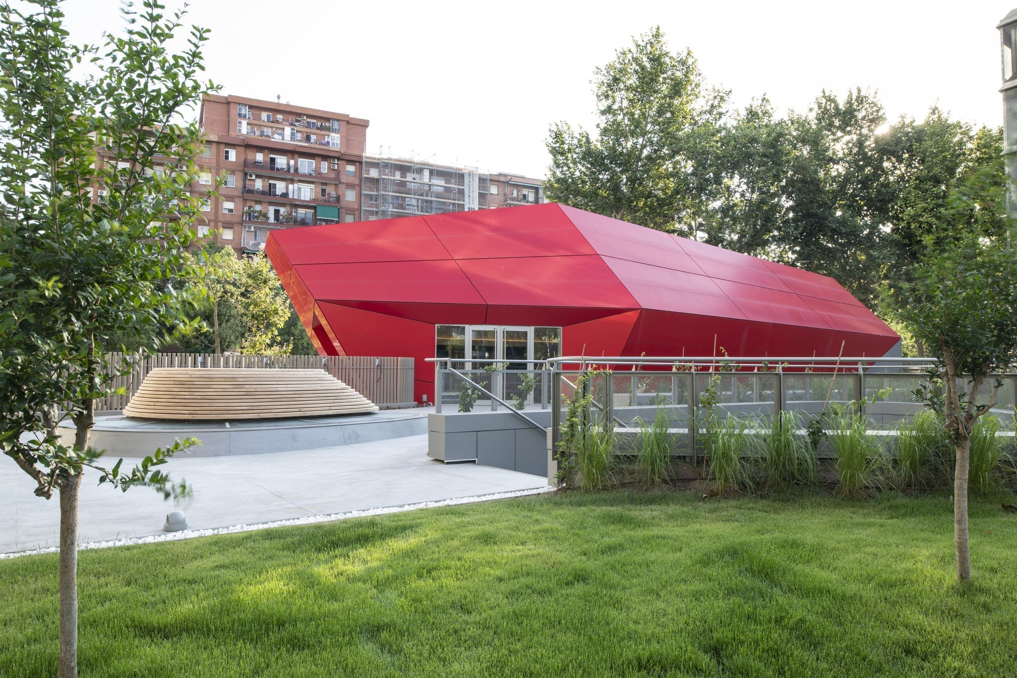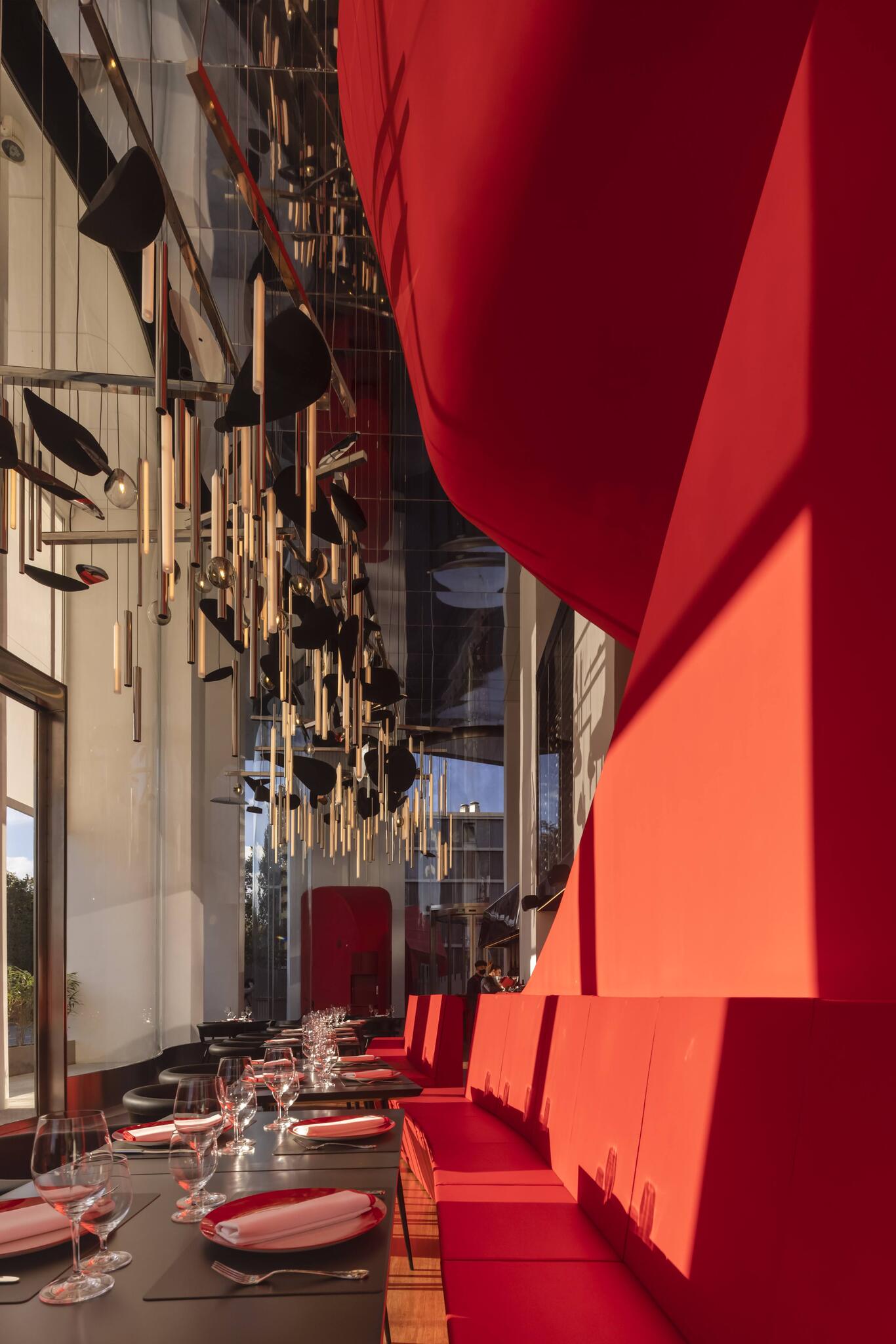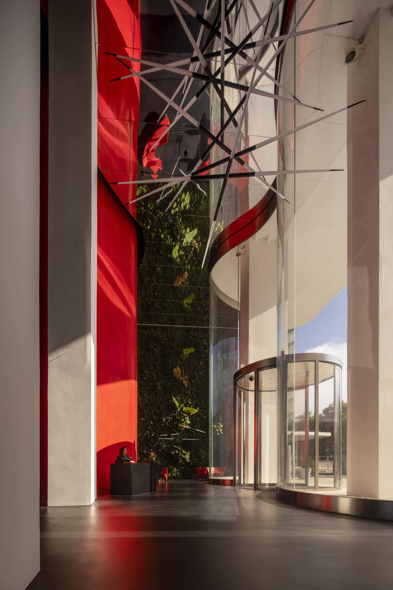 Communal areas of the Antares Barcelona building get a dash of Decq’s drama and fun. The triple-height reception is a showpiece in itself with its colonnade-style exterior pillars and walls of curved glass. The on-site restaurant is dominated by a red-painted statement staircase and even the underground car park is decorated in shades of Decq’s trademark colours of deep red and black. Light fittings and furnishings in the public areas have been created by Decq as works of art. The playful entertainment pavilion with its bright-red colour scheme and angular shape is inspired by two of Barcelona’s most famous artists, Miró and Gaudí.