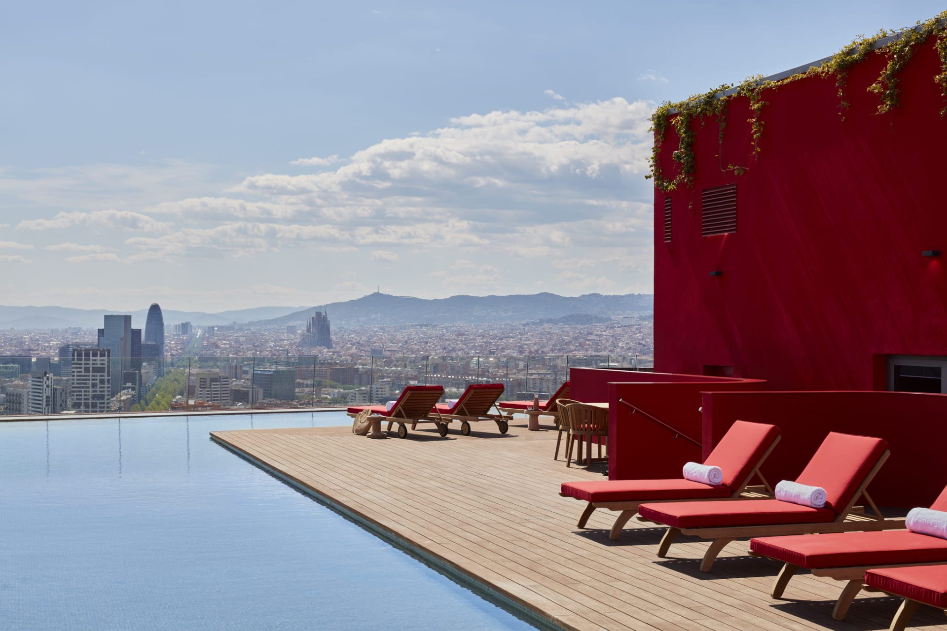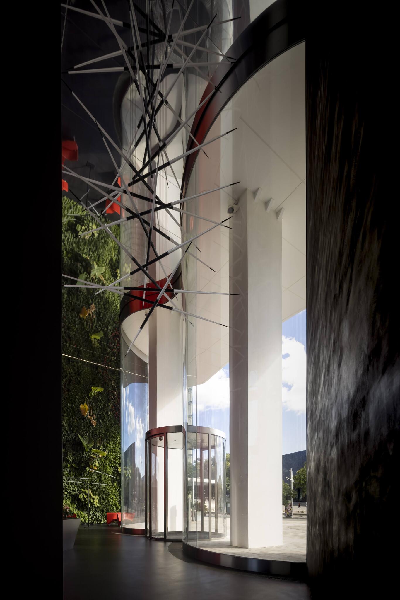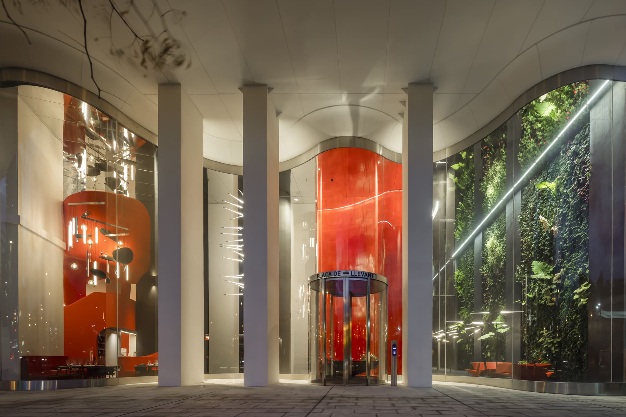 Communal areas of the Antares Barcelona building get a dash of Decq’s drama and fun. The triple-height reception is a showpiece in itself with its colonnade-style exterior pillars and walls of curved glass. The on-site restaurant is dominated by a red-painted statement staircase and even the underground car park is decorated in shades of Decq’s trademark colours of deep red and black. Light fittings and furnishings in the public areas have been created by Decq as works of art. The playful entertainment pavilion with its bright-red colour scheme and angular shape is inspired by two of Barcelona’s most famous artists, Miró and Gaudí.